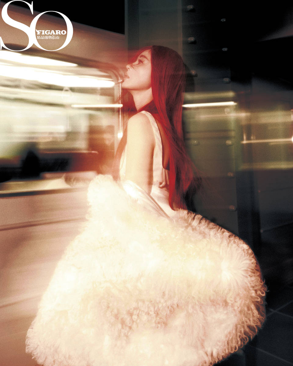 大片的场景叙事更深化了都市浪漫的主题。镜头下,张天爱或倚靠在玻璃幕墙边,身后是璀璨的城市霓虹,红色长发在微风中轻扬;或漫步于雨后的街道,黑色皮衣上凝结的水珠与地面倒影相映成趣。摄影师巧妙运用冷暖光对比,让红色发丝在冷调背景中更显明艳,而皮衣的黑色剪影又为整体画面增添了电影感层次。这种”在钢筋森林中绽放温柔力量”的视觉表达,精准捕捉到了当代都市女性的生活姿态。